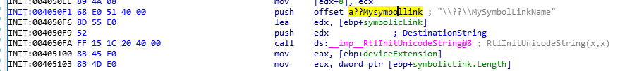 从上面两幅图中可以看到调用RtlInitUnicodeString函数并使用符号链接名来初始化变量,而且看最左侧还有INIT标记。