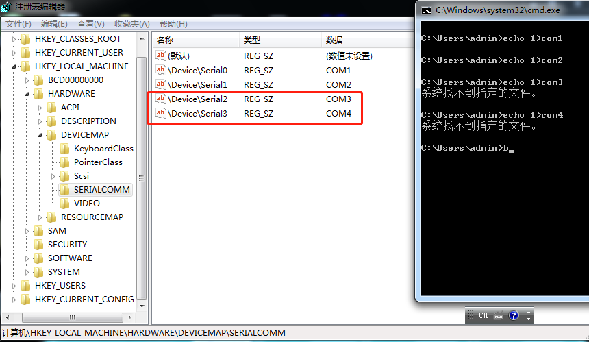 在上图中使用cmd 往串口写数据 COM1和COM2都可以写入,COM3和COM4提示系统找不到对应的文件,那是因为不存在这个串口,在驱动中创建此设备就可以打开。