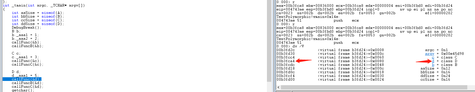 当调用callFuncC时,需要将D对象转化为C对象指针,D对象地址为00b3fca4