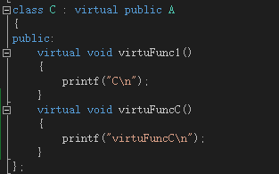 V形继承如基类A,基类B,类C继承于A与B,如果类A与类B中都存在虚函数,那么类C中就存在两个虚函数表指针,这也是比较简单的结构,如: