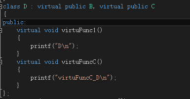 如上,在B类中实现了virtuFunc1方法,需要注意的是如果在B类中不实现此方法,同样也无法编写B b这样的代码,当前已经编写了,所以可以编写B b的代码。