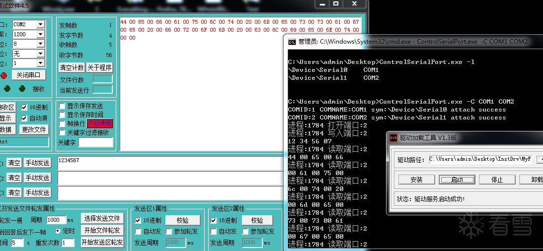 2、以管理员权限使用-C参数来监控过滤串口,形式为ControlSerialPort.exe -C COM1 COM2 可以监控多个串口,也可以只监控一个串口,程序会根据串口号得到注册表Hardware\\DeviceMap\\SerialComm下的串口信息:设备名称如\Device\Serial0,使用DeviceIoControl将设备名称传入驱动程序中进行绑定。绑定需要绑定的串口后,如果存在串口可以绑定成功,那么会调用ReadFile读取过滤到的串口信息,包括打开串口、发送信息、收到信息、关闭串口这四种类型的消息。