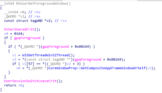 获取当前顶层窗口使用win32kfull!NtUserGetForegroundWindow,里面会寻找