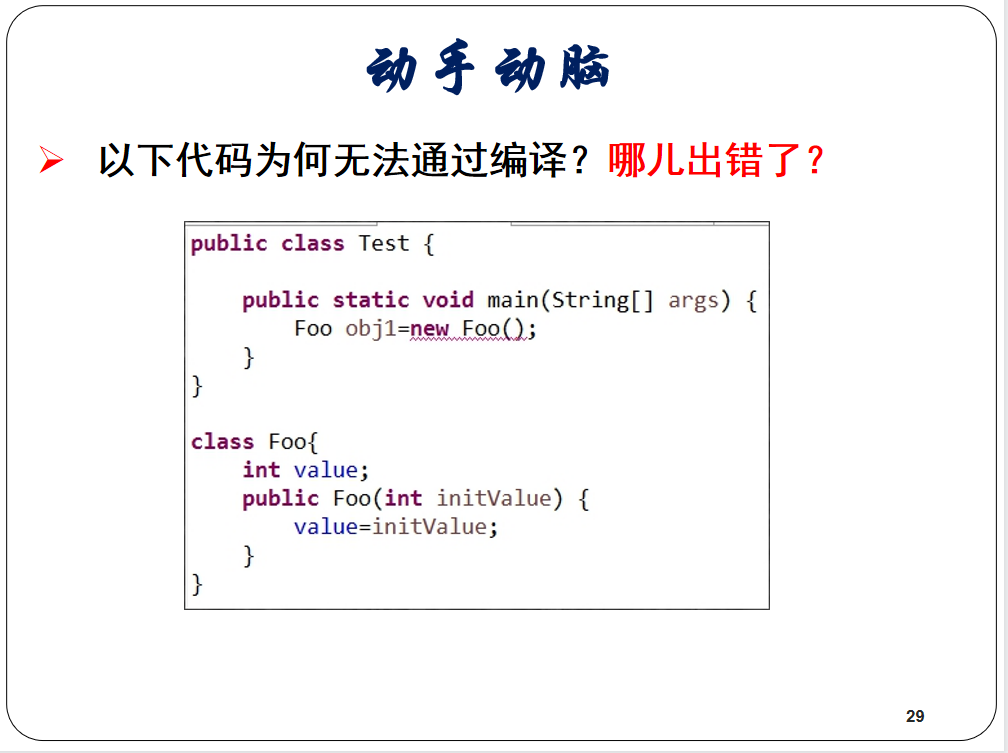 该代码在Foo obj1= new Foo() ;的地方出错了,出错原因是main方法在引用变量时Foo()没有被定义,Foo类中只有一个有参构造,没有无参构造.