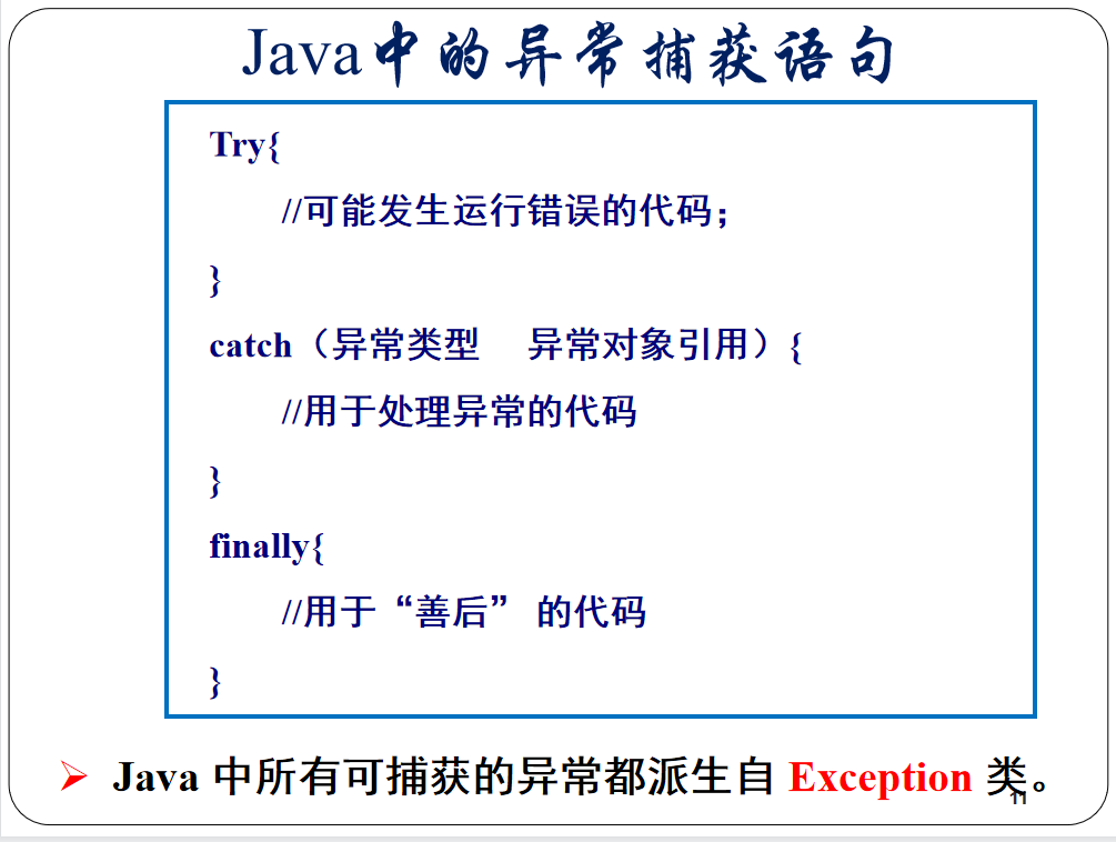 使用catch语句,只能捕获Exception类及其子类的对象。因此,一个捕获Exception对象的catch语句块可以捕获所有“可捕获”的异常。