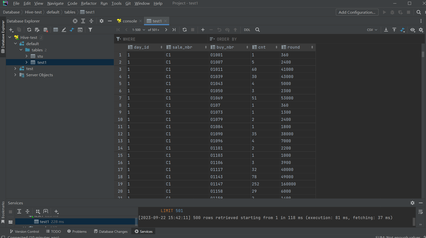 load data inpath '/data/sales_sample_20170310.csv' into table test1;