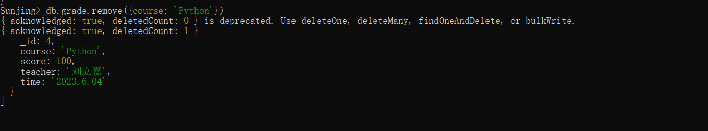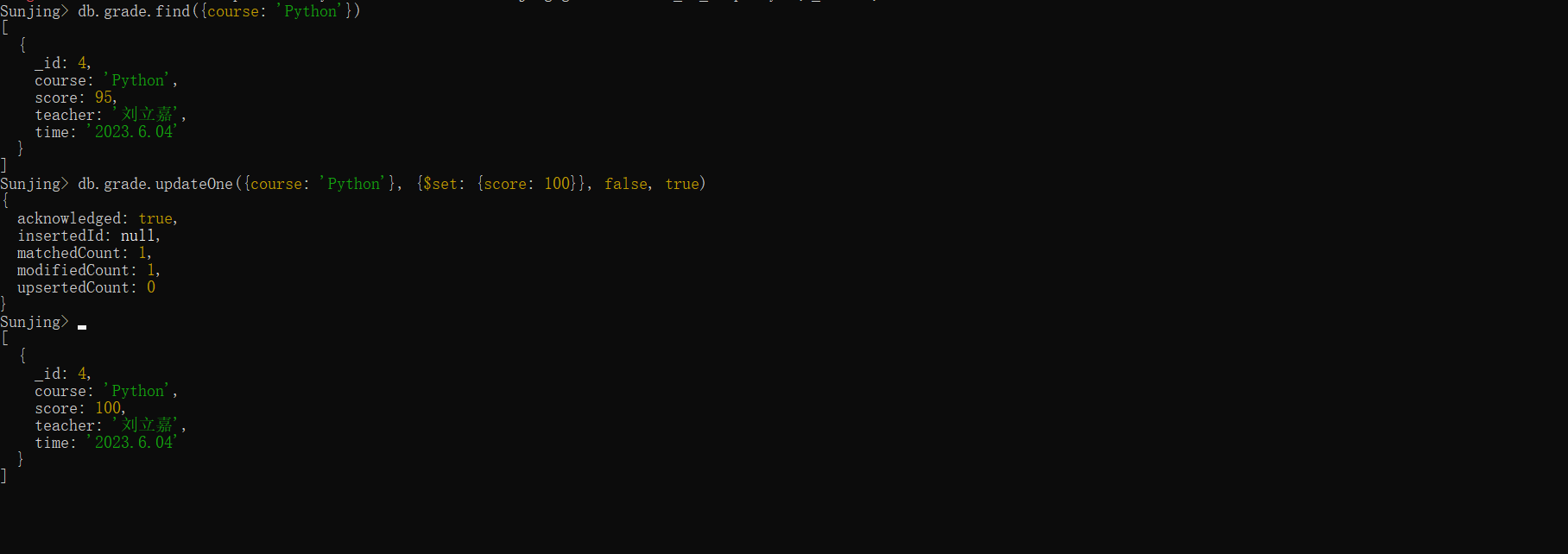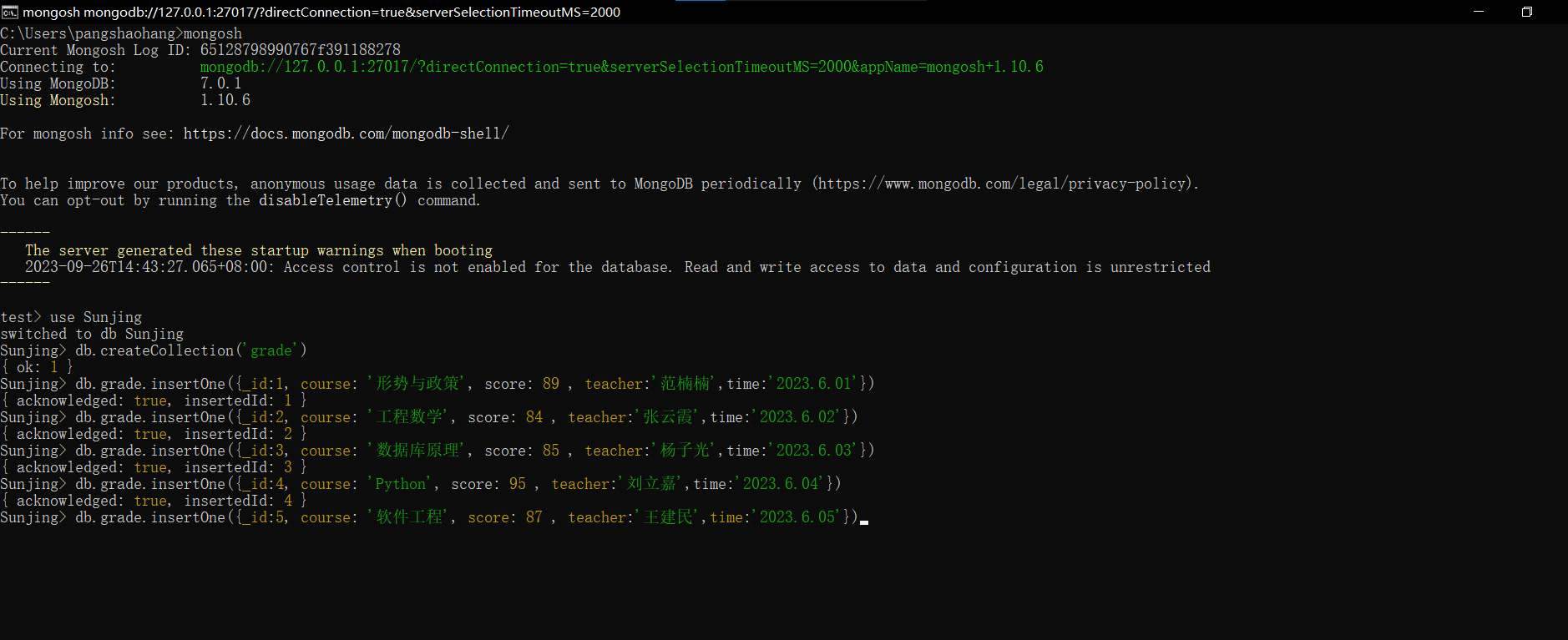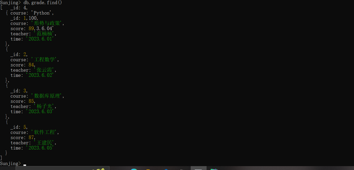 请在电脑中完成MongoDB的安装,并通过MongoDB Shell新建一个以自己名字(英文全拼,例如Sunjing)的数据库,并创建一个名为“grade”的集合,在该集合中插入自己上学期五门课程的成绩数据,具体包括课程名称,分数,任课教师,考试时间(或者其他相关信息)。并依次完成对数据进行增、删、改、查等基本操作,上传屏幕截图。有能力的同学可以试着使用其他编程软件简单调用MongoDB。参考教程:https://dblab.xmu.edu.cn/blog/3980/