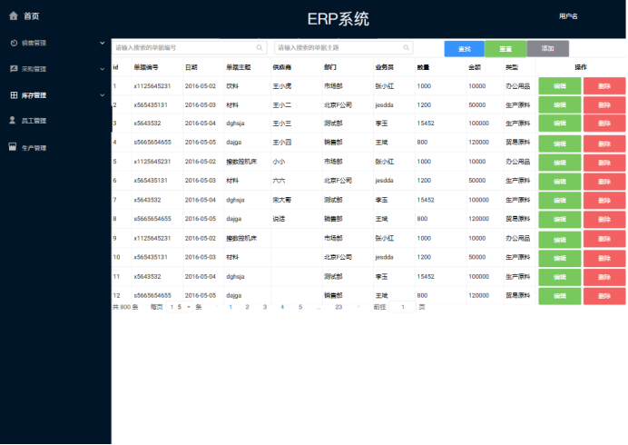 4.点击菜单栏采购管理,可进入采购管理界面,在这个界面能够进行采购信息的录入,采购信息的修改,删除以及可根据采购单据编号和单据主题进行查询.设计界面如下图: