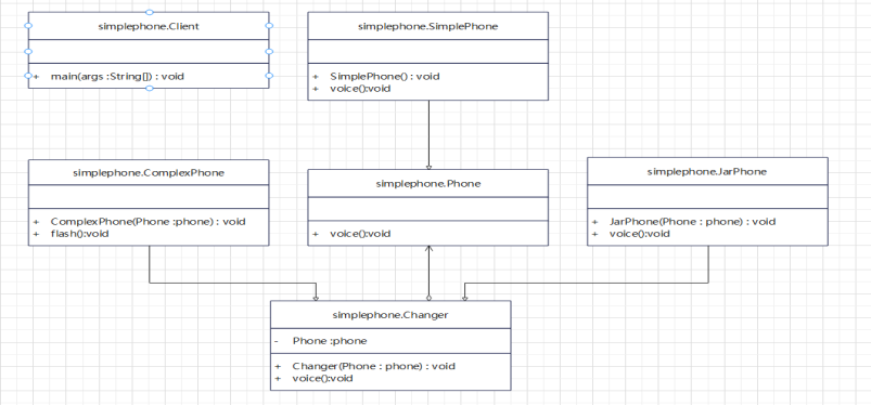 用装饰模式模拟手机功能的升级过程:简单的手机(SimplePhone)在接收来电时,会发出声音提醒主人;而JarPhone除了声音还能振动;更高级的手机(ComplexPhone)除了声音、振动外,还有灯光闪烁提示。