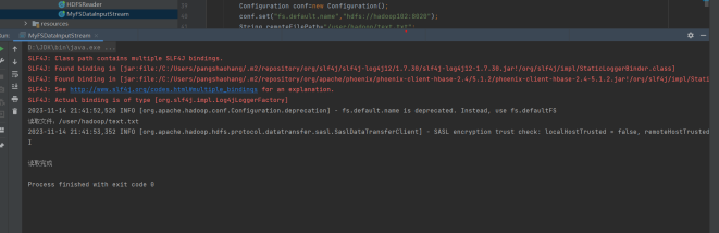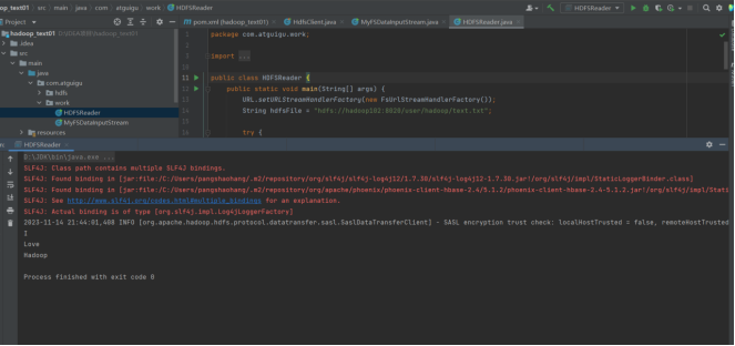 (三)查看Java帮助手册或其它资料,用“java.net.URL”和“org.apache.hadoop.fs.FsURLStreamHandlerFactory”编程完成输出HDFS中指定文件的文本到终端中。
