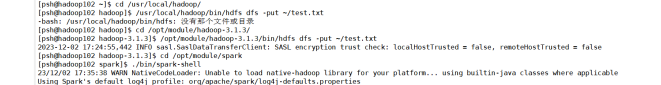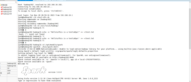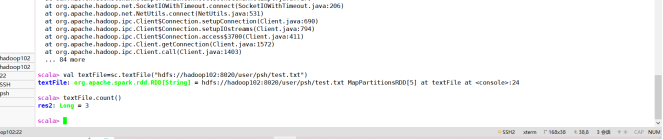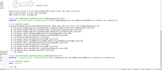 (2)在spark-shell中读取HDFS系统文件“/user/hadoop/test.txt”(如果该文件不存在,请先创建),然后,统计出文件的行数;