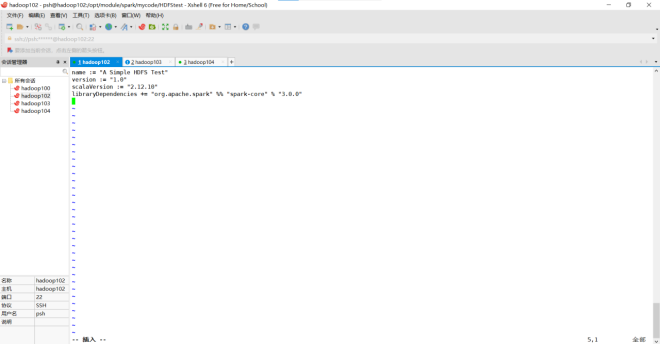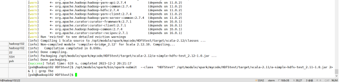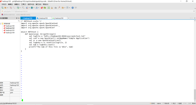 (3)编写独立应用程序(推荐使用Scala语言),读取HDFS系统文件“/user/hadoop/test.txt”(如果该文件不存在,请先创建),然后,统计出文件的行数;通过sbt工具将整个应用程序编译打包成 JAR包,并将生成的JAR包通过 spark-submit 提交到 Spark 中运行命令。