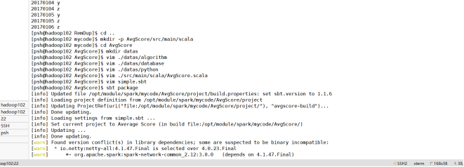 进入到 mycode 目录,新建 AvgScore 目录,新建 datas 目录,写入文件 algorithm、database、python,编写 Scala 文件和 simple.sbt 文件,然后打包.