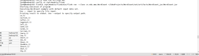 最后,到Flink中运行FlinkWordCount.jar。这里一定要注意,要确认已经开启Flink系统。运行的命令和执行结果如下图所示。