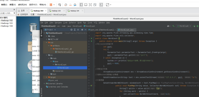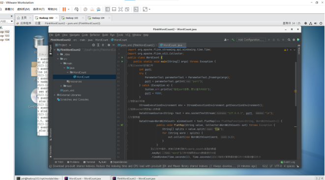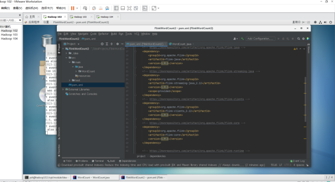 仿照前面的WordCount项目的开发流程,在IntelliJ IDEA中新建一个项目,名称为“FlinkWordCount2”。新建一个pom.xml文件,内容和前面的WordCount项目中的pom.xml一样。新建一个代码文件WordCount.java.