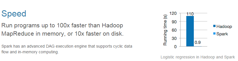 与Hadoop的MapReduce相比,Spark基于内存的运算要快100倍以上,基于硬盘的运算也要快10倍以上。Spark实现了高效的DAG执行引擎,可以通过基于内存来高效处理数据流。计算的中间结果是存在于内存中的。