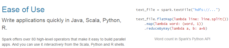 Spark支持Java、Python和Scala的API,还支持超过80种高级算法,使用户可以快速构建不同的应用。而且Spark支持交互式的Python和Scala的shell,可以非常方便地在这些shell中使用Spark集群来验证解决问题的方法。