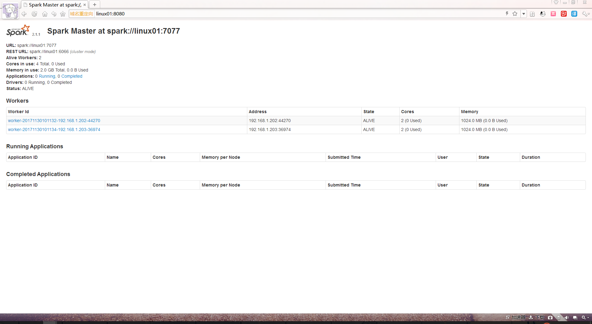 启动后执行jps命令,主节点上有Master进程,其他子节点上有Work进行,登录Spark管理界面查看集群状态(主节点):http://linux01:8080/