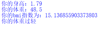 1 height=1.79 2 print("你的身高:"+str(height)) 3 weight=48.5 4 print("你的体重:"+str(weight)) 5 bmi=weight/(height*height) 6 print("你的bmi指数为:"+str(bmi)) 7 8 #判断身材是否合理 9 if bmi<18.5 : 10 print("你的体重过轻") 11 if bmi>=18.5 and bmi<24.9: 12 print("正常范围,注意保持") 13 if bmi>=24.9 and bmi<29.9 : 14 print("你的体重过重") 15 if bmi>=29.9 : 16 print("肥胖")