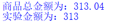 money_all =56.75 + 72.91 + 88.5 + 26.37 + 68.51 money_all_str = str(money_all) print("商品总金额为:"+money_all_str) money_real = int(money_all) money_real_str = str(money_real) print("实验金额为:"+money_real_str)