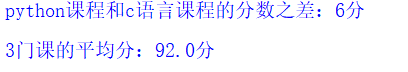 python = 95 english = 92 c = 89 sub = python - c avg = (python + english + c)/3 print("python课程和c语言课程的分数之差:"+str(sub) + "分\n") print("3门课的平均分:"+str(avg)+ "分")