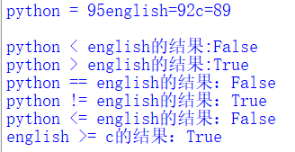 1 python = 95 2 english = 92 3 c = 89 4 5 #输出3个变量的值 6 print("python = "+str(python)+"english="+str(english)+"c="+str(c)+"\n") 7 print("python < english的结果:"+str(python < english)) 8 print("python > english的结果:"+str(python > english)) 9 print("python == english的结果:"+str(python == english)) 10 print("python != english的结果:"+str(python != english)) 11 print("python <= english的结果:"+str(python <= english)) 12 print("english >= c的结果:"+str(python >= c))