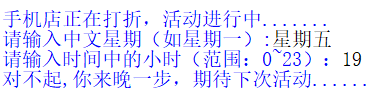 1 print("\n手机店正在打折,活动进行中.......") 2 strweek = input("请输入中文星期(如星期一):") 3 intime = int(input("请输入时间中的小时(范围:0~23):")) 4 5 #判断是否满足活动参与条件(使用了if条件语句) 6 if(strweek == "星期二"and (intime>=10 and intime<=11))or(strweek=="星期五" and (intime >= 14 and intime <= 15)): 7 print("恭喜你,获得了折扣活动参与资格,快快选购吧!") 8 else: 9 print("对不起,你来晚一步,期待下次活动......")