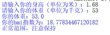 1 height = float(input("请输入你的身高(单位为米):")) 2 weight = float(input("请输入你的体重(单位为千克):")) 3 print("你的体重:"+str(weight)) 4 bmi=weight/(height*height) 5 print("你的bmi指数为:"+str(bmi)) 6 7 #判断身材是否合理 8 if bmi<18.5 : 9 print("你的体重过轻") 10 if bmi>=18.5 and bmi<24.9: 11 print("正常范围,注意保持") 12 if bmi>=24.9 and bmi<29.9 : 13 print("你的体重过重") 14 if bmi>=29.9 : 15 print("肥胖")