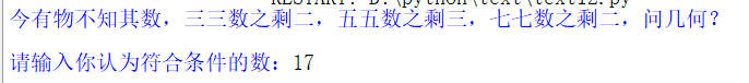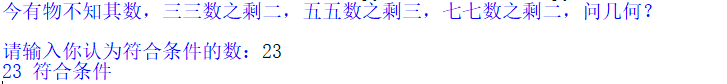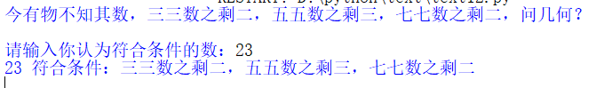 1 print("今有物不知其数,三三数之剩二,五五数之剩三,七七数之剩二,问几何?\n") 2 number = int(input("请输入你认为符合条件的数:")) 3 if number%3== 2 and number%5 == 3 and number%7 == 2: 4 print(number,"符合条件:三三数之剩二,五五数之剩三,七七数之剩二")