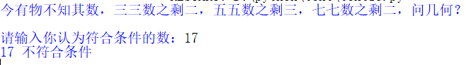 1 print("今有物不知其数,三三数之剩二,五五数之剩三,七七数之剩二,问几何?\n") 2 number = int(input("请输入你认为符合条件的数:")) 3 if number%3== 2 and number%5 == 3 and number%7 == 2: 4 print(number,"符合条件") 5 else: 6 print(number,"不符合条件")