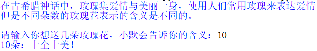 1 print("在古希腊神话中,玫瑰集爱情与美丽一身,使用人们常用玫瑰来表达爱情") 2 print("但是不同朵数的玫瑰花表示的含义是不同的。\n") 3 #获取用户输入的朵数,并转换为整型 4 number = int(input("请输入你想送几朵玫瑰花,小默会告诉你的含义:")) 5 if number == 1: 6 #如果等于1则输出提示信息 7 print("1朵:你是我的唯一") 8 elif number ==3: 9 print("3朵:I love You!") 10 elif number ==10: 11 print("10朵:十全十美!") 12 elif number ==99: 13 print("99朵:天长地久") 14 elif number ==108: 15 print("108朵:求婚!") 16 else: 17 print("小默也不知道了!可以考虑送1朵,3朵,10朵,99朵或108朵哟!")