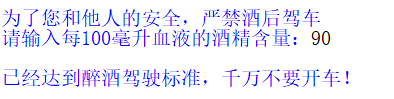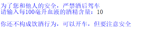1 print("\n为了您和他人的安全,严禁酒后驾车") 2 proof = int(input("请输入每100毫升血液的酒精含量:")) 3 if proof <20: 4 print("\n你还不构成饮酒行为,可以开车,但要注意安全") 5 else: 6 if 80 > proof >=20: 7 print("\n已经达到酒后驾驶标准,请不要开车!") 8 else: 9 print("\n已经达到醉酒驾驶标准,千万不要开车!")