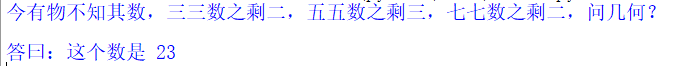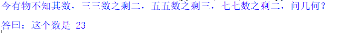 1 print("今有物不知其数,三三数之剩二,五五数之剩三,七七数之剩二,问几何?\n") 2 for number in range(100): 3 if number%3== 2 and number%5 == 3 and number%7 == 2: 4 print("答曰:这个数是",number)