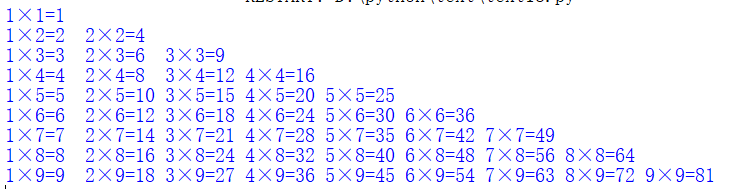 1 for i in range(1,10): 2 for j in range(1,i+1): 3 print(str(j)+"×"+str(i)+"="+str(i*j)+"\t",end='') 4 print('')