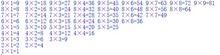 1 for i in range(9,0,-1): 2 for j in range(1,i+1): 3 print(str(i)+"×"+str(j)+"="+str(i*j)+"\t",end='') 4 print('')