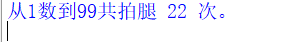 1 total = 99 2 for number in range(1,100): 3 if number % 7 ==0: 4 continue 5 else: 6 string = str(number) 7 if string.endswith('7'): 8 continue 9 total -=1 10 print("从1数到99共拍腿",total,"次。")