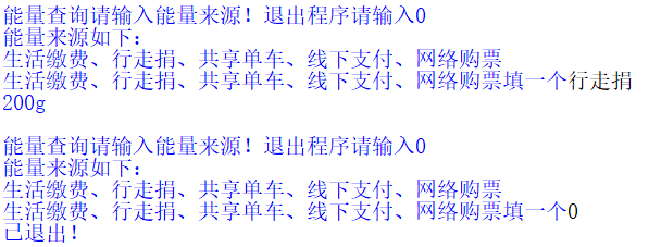 1 for i in range(100): 2 print(""" 3 能量查询请输入能量来源!退出程序请输入0 4 能量来源如下: 5 生活缴费、行走捐、共享单车、线下支付、网络购票""") 6 tip = input("生活缴费、行走捐、共享单车、线下支付、网络购票填一个") 7 if tip == '生活缴费': 8 print('262g') 9 continue 10 elif tip =='行走捐': 11 print('200g') 12 continue 13 elif tip == '共享单车': 14 print('160g') 15 continue 16 elif tip == '线下支付': 17 print('5g') 18 continue 19 elif tip == '网络购票': 20 print('180g') 21 continue 22 elif tip == '0': 23 print('已退出!') 24 break 25 else: 26 continue