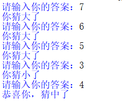 1 #导入随机生成模块 2 import random 3 #随机生成一个1-10(包括1和10)的随机数 4 answer = random.randrange(1,11) 5 while True: 6 your_answer = int(input("请输入你的答案:")) 7 if your_answer>answer: 8 print("你猜大了") 9 elif your_answer<answer: 10 print("你猜小了") 11 else: 12 print("恭喜你,猜中了") 13 break