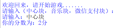 1 for i in range(100): 2 print(""" 3 -------------------------跳一跳------------------------ 4 5 欢迎回来,请开始游戏.......""") 6 print("请输入(中心块,音乐块,微信支付块):") 7 tip = input("请输入:") 8 if tip == '中心块': 9 print('你的分数为:2分') 10 continue 11 elif tip == '音乐块': 12 print('你的分数为:32分') 13 continue 14 elif tip == '微信支付块': 15 print('你的分数为:42分') 16 continue 17 else: 18 continue