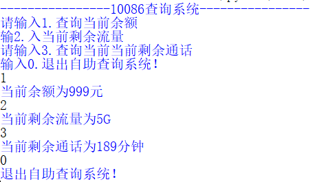 1 nt("----------------10086查询系统----------------") 2 print("请输入1.查询当前余额\n输2.入当前剩余流量\n请输入3.查询当前当前剩余通话\n输入0.退出自助查询系统!") 3 none = True 4 while none: 5 number=input() 6 if number == "1": 7 print("当前余额为999元") 8 elif number == "2": 9 print("当前剩余流量为5G") 10 elif number =="3": 11 print("当前剩余通话为189分钟") 12 elif number == "0": 13 print("退出自助查询系统!") 14 none=False