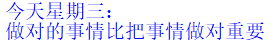 1 import datetime 2 #定义一个列表 3 mot = ["今天星期一:\n坚持下去不是因为我很坚强,而是因为我别无选择。", 4 "今天星期二:\n含泪播种的人一定会有收货", 5 "今天星期三:\n做对的事情比把事情做对重要", 6 "今天星期四:\n命运给予我们的不是失望之酒,而是机会之杯", 7 "今天星期五:\n不要等到明天,明天太遥远,今天就行动", 8 "今天星期六:\n求知若渴,虚心若愚", 9 "今天星期七:\n成功将属于那些从不说“不可能”的人"] 10 day=datetime.datetime.now().weekday() 11 print(mot[day])