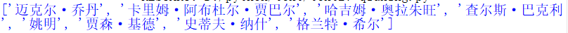 1 #NBA名人堂原有人员 2 oldlist = ["迈克尔·乔丹","卡里姆·阿布杜尔·贾巴尔","哈吉姆·奥拉朱旺","查尔斯·巴克利","姚明"] 3 newlist = ["贾森·基德","史蒂夫·纳什","格兰特·希尔"] 4 oldlist.extend(newlist) 5 print(oldlist)