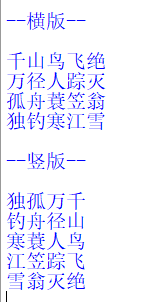 1 str1 = "千山鸟飞绝" 2 str2 = "万径人踪灭" 3 str3 = "孤舟蓑笠翁" 4 str4 = "独钓寒江雪" 5 verse = [list(str1),list(str2),list(str3),list(str4)] 6 print("\n--横版--\n") 7 for i in range(4): 8 for j in range(5): 9 if j == 4: 10 print(verse[i][j]) 11 else: 12 print(verse[i][j],end="") 13 verse.reverse() 14 print("\n--竖版--\n") 15 for i in range(5): 16 for j in range(4): 17 if j == 3: 18 print(verse[j][i]) 19 else: 20 print(verse[j][i],end="")