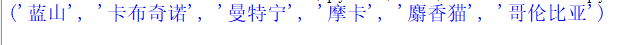 1 coffeename = ('蓝山','卡布奇诺','曼特宁','摩卡','麝香猫','哥伦比亚') 2 print(coffeename)