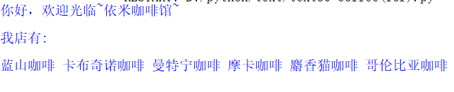 1 coffeename = ('蓝山','卡布奇诺','曼特宁','摩卡','麝香猫','哥伦比亚') 2 print("你好,欢迎光临~依米咖啡馆~\n\n我店有:\n") 3 for name in coffeename: 4 print(name+"咖啡",end = " ")
