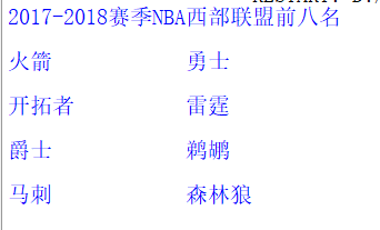 1 print("2017-2018赛季NBA西部联盟前八名\n") 2 team = ["火箭","勇士","开拓者","雷霆","爵士","鹈鹕","马刺","森林狼"] 3 for index,item in enumerate(team): 4 if index%2 == 0: 5 print(item+ "\t\t",end='') 6 else: 7 print(item + "\n")