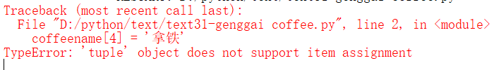 1 coffeename = ('蓝山','卡布奇诺','曼特宁','摩卡','麝香猫','哥伦比亚') 2 coffeename[4] = '拿铁' 3 print(coffeename)