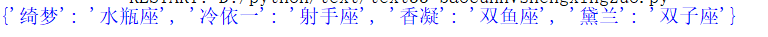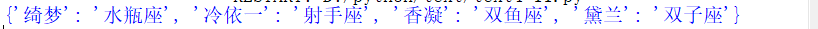 1 name = ['绮梦','冷依一','香凝','黛兰'] 2 sign = ['水瓶','射手','双鱼','双子'] 3 dictionary = {i:j+'座'for i,j in zip(name,sign)} 4 print(dictionary)