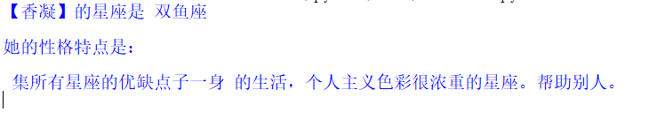 1 name = ['绮梦','冷依一','香凝','黛兰'] 2 sign_person = ['水瓶座','射手座','双鱼座','双子座'] 3 person_dict = dict(zip(name,sign_person)) 4 sign_all=['白羊座','金牛座','双子座','巨蟹座','狮子座','处女座','天秤座','天蝎座','射手座','摩羯座','水瓶座','双鱼座'] 5 nature=['有一种让人看见就觉得开心的感觉,阳光、乐观、坚强,性格直来直去,就是有点小脾气', 6 '很保守,喜欢稳定,一旦有什么变动就会觉得心里不踏实,性格比较慢热,是个理财高手', 7 '喜欢追求新鲜感,有点小聪明,耐心不够,因你的可爱性格会让很多人喜欢和你做朋友', 8 '情绪容易敏感,缺乏安全感,做事情有坚持到底的毅力,为人重义,对朋友和家人特别忠实', 9 '有着远大的理想,总想靠自己的努力成为人上人,总是期待被仰慕被崇拜的感觉', 10 '坚持追求自己的完美主义者', 11 '追求平等、和谐,交际能力强,因此朋友较多。最大的缺点就是面对选择总是犹豫不决。', 12 '精力旺盛,占有欲强,对于生活很有目标,不达目的誓不哭休,复仇心重', 13 '崇尚自由,勇敢、果断、独立身上有一股勇往直前的劲儿,只要想做,就能做。', 14 '是最有耐心的,做事最小心。做事脚踏实地比较固执,不达目的不罢休,而且非常勤奋', 15 '人很聪明,最大的特点是创新,追求独一无二', 16 '集所有星座的优缺点子一身 的生活,个人主义色彩很浓重的星座。帮助别人。'] 17 sign_dict = dict(zip(sign_all,nature)) 18 print("【香凝】的星座是",person_dict.get("香凝")) 19 print("\n她的性格特点是:\n\n",sign_dict.get(person_dict.get("香凝")))